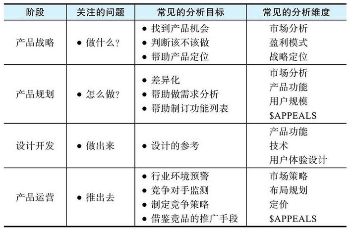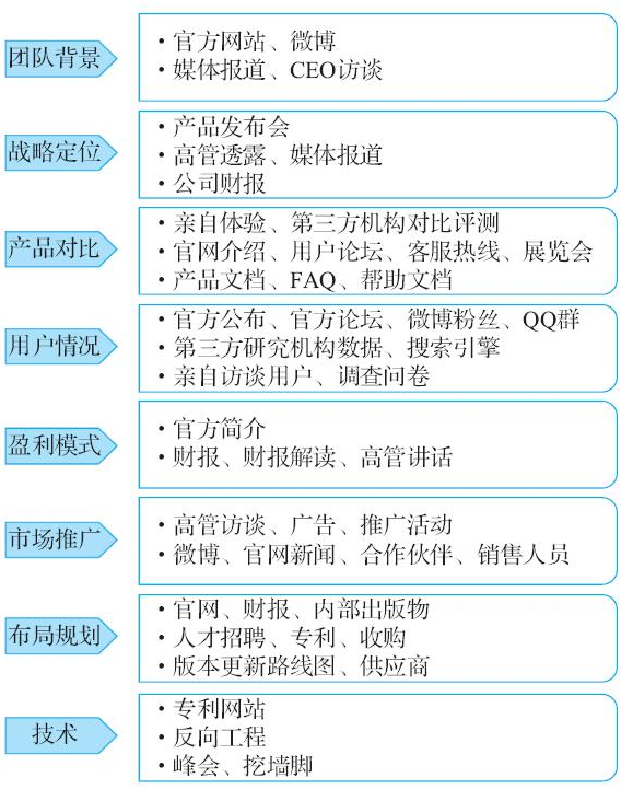 可以从产品和用户两个视角来进行产品分析。产品视角是从影响一个产品成败的因素进行分析,用户视角是从用户的角度看用户在选择产品时会关注哪些方面。举例来说,对于某类没有明显差距的产品,用户的角度可能关注的是产品的价格,而从产品角度则关注的是供应链和生产技术等问题,而这些是用户在选择产品时不会触及到的。从用户视角收集竞品信息可以采用问卷访谈等方法。