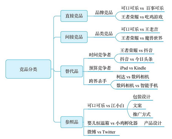 1.当目的是 决策支持 预警避险 时,可以从品牌竞品,品类竞品,替代品中寻找竞品,具体原则根据竞品的市场份额、大公司背景、用户反馈、跨界替代品进行选择。
