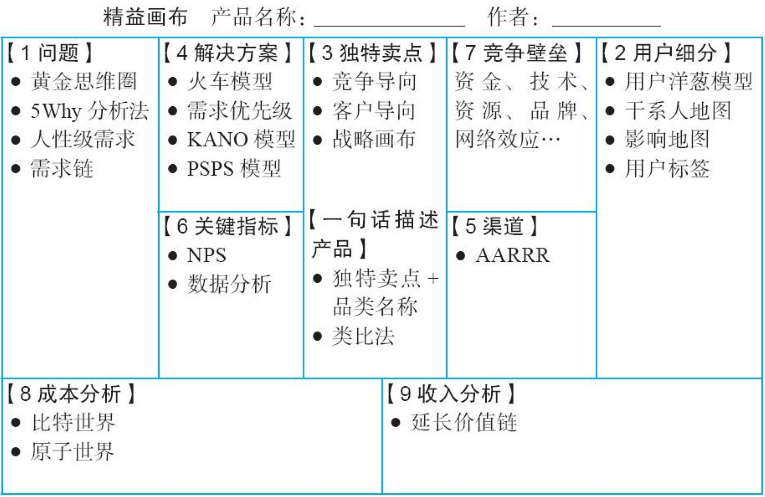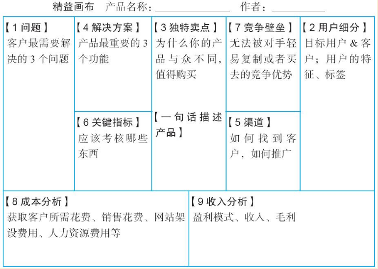 精益画布用于规划和分析产品商业模式。Ash Maurya在《精益创业实战》中提出精益画布,其可以帮助产品经理更全面的思考、决策,从系统、商业的角度来规划产品、分析产品,建立产品的全局观。精益画布可以用于产品规划、分析竞品商业模式以及交流讨论。