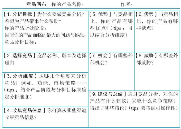 竞品画布相当于竞品分析报告的MVP(最小可用产品)。可以帮助快速上手竞品分析,以及提早验证思路,避免写出一份不符合要求思路的竞品分析报告。