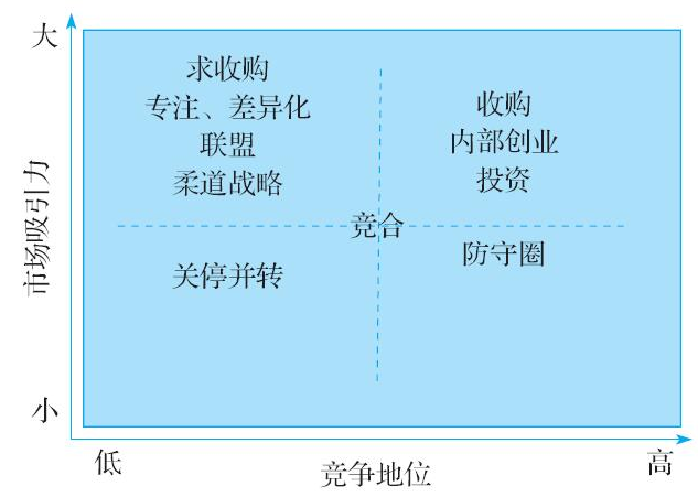- 专注战略: 也叫细分市场战略,为某个特殊用户群或细分市场提供服务。 适用于比较狭小的市场。