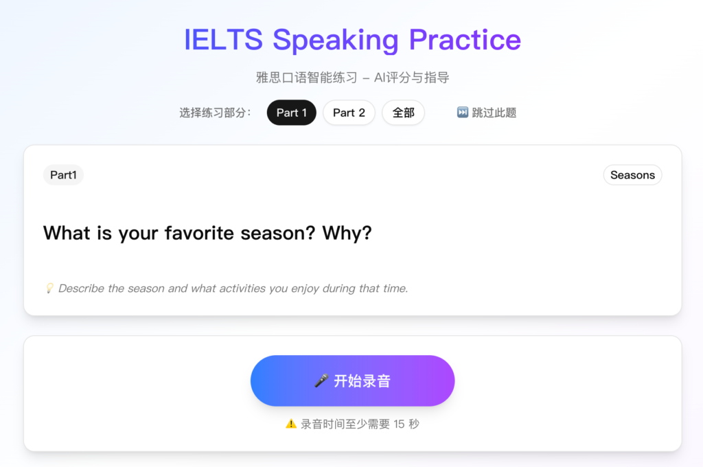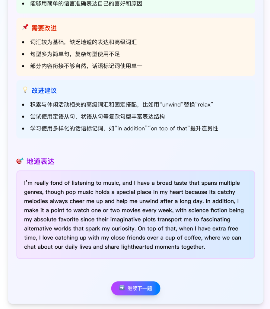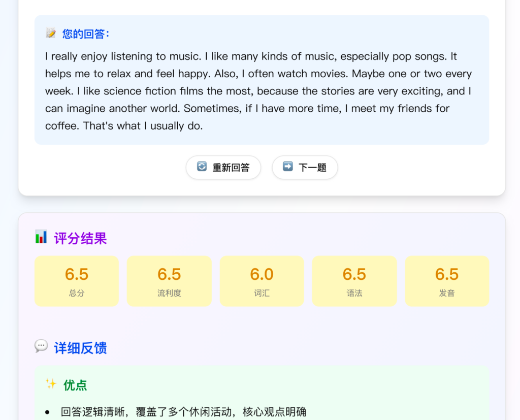 根据选择的题型随机生成题目,点击开始录音可以根据题型限制录音时长。录音结束后进行语音识别,并通过AI对识别结果进行分析,给出评分、改进建议和AI扩写的答案。