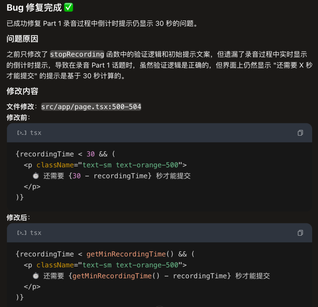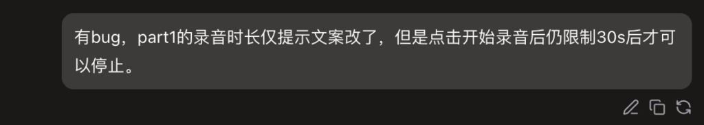 这里题目下方的灰色提示是AI自动补全的功能,prompt并未做要求,同时录音时间的文字提示也是AI补全的,页面也是响应式,交互总体比较友好。我也没有对UI风格做要求,感觉AI味比较浓(非贬义),第一遍生成的字体较小做了一次调整。